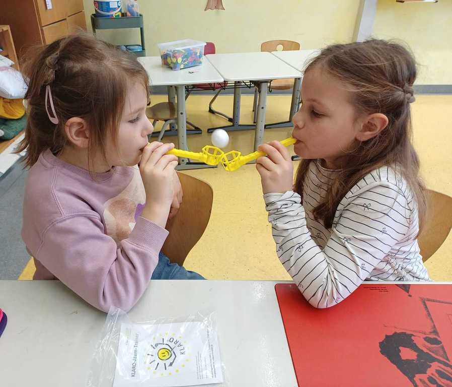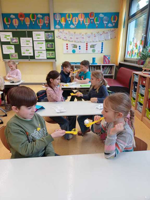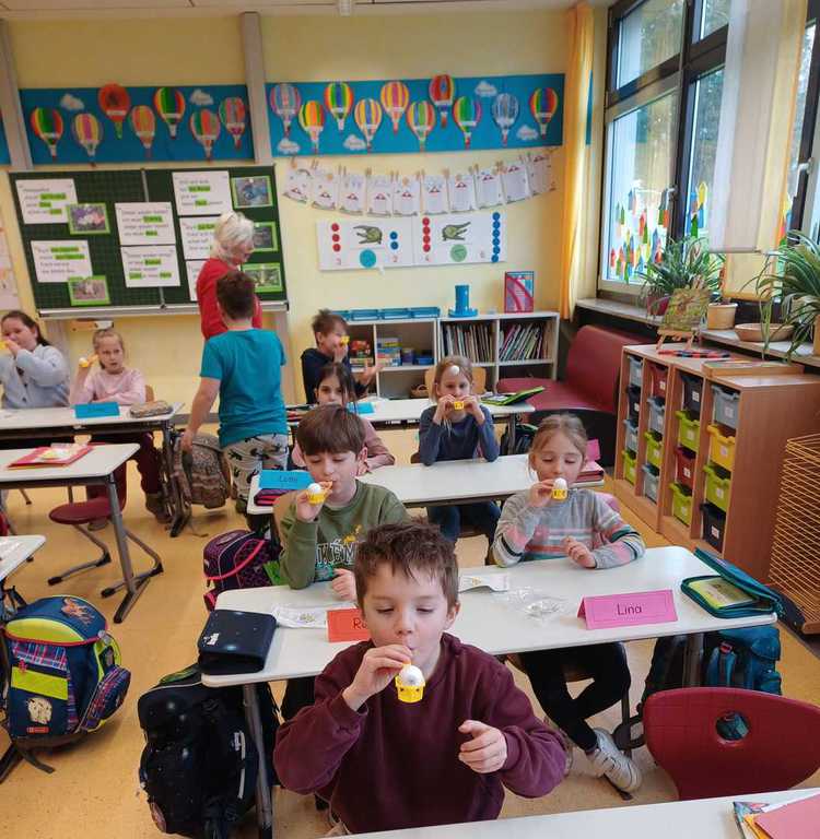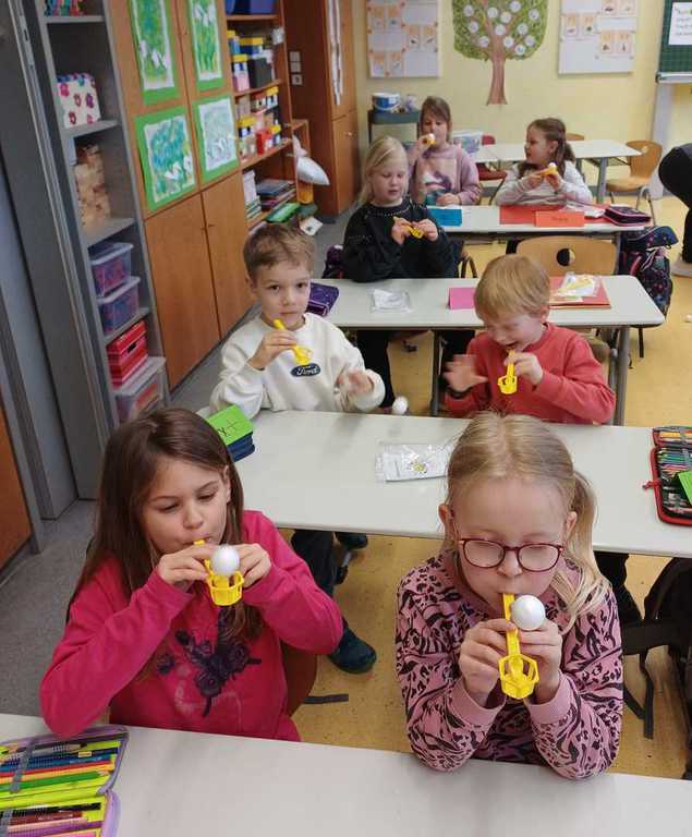 Unsere Erstklässler erforschen zurzeit den Weg der Luft durch den Körper und lernen dabei die einfachste Entspannungsübung der Welt kennen: das tiefe Ausatmen. Sie erfahren, warum sich ihr Körper bewegen kann und dass er eine ausgewogene Ernährung braucht, um gesund zu bleiben.