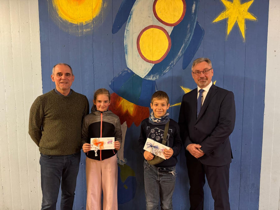 Die Schulsieger der Grundschule Hofheim bekamen am Dienstag, 28.10.2025, von Elmar Zehnter die Preise der Raiffeisenbank Hofheim überreicht. Mathemeisterin wurde Amelie Ancel, Mathemeister wurde Jan Hümpfner, beide aus der Klasse 4b.